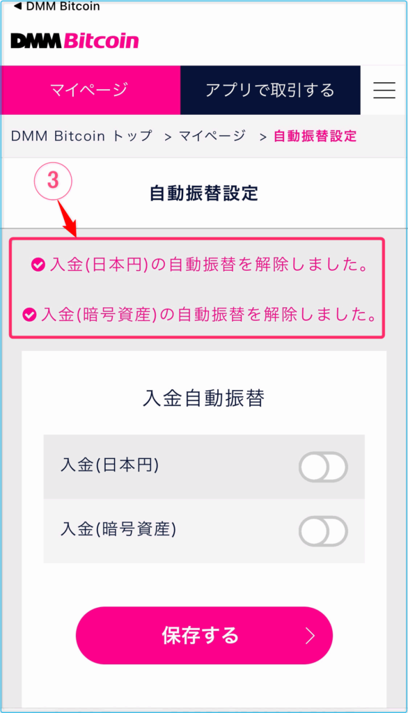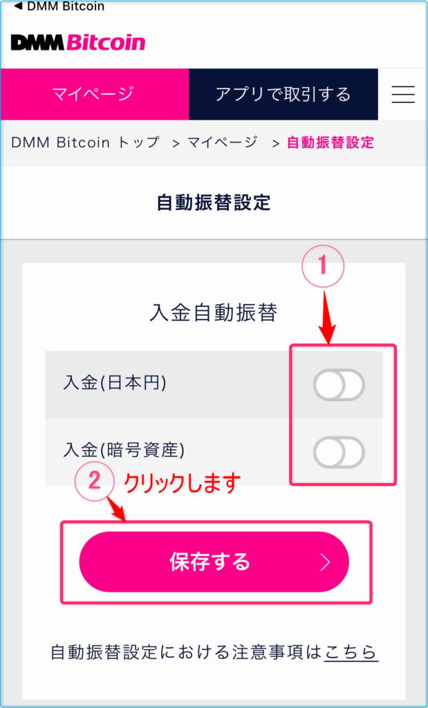 ① 「入金自動振替」の設定を必要に応じて(日本円)と(暗号資産)を「OFF]にします。