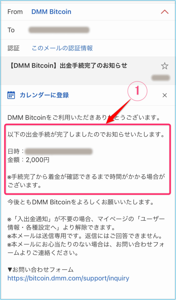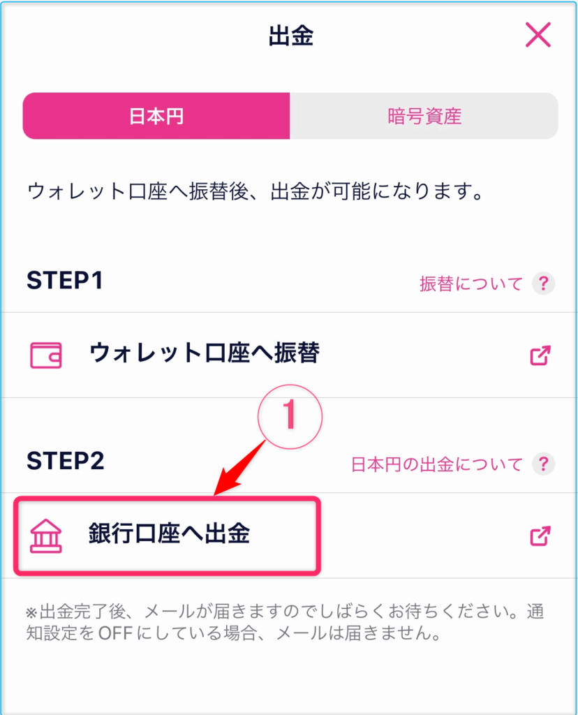① あなたが登録した銀行口座へ出金手続きした金額が入金されるとあたが登録したアドレスへメールが届きます。