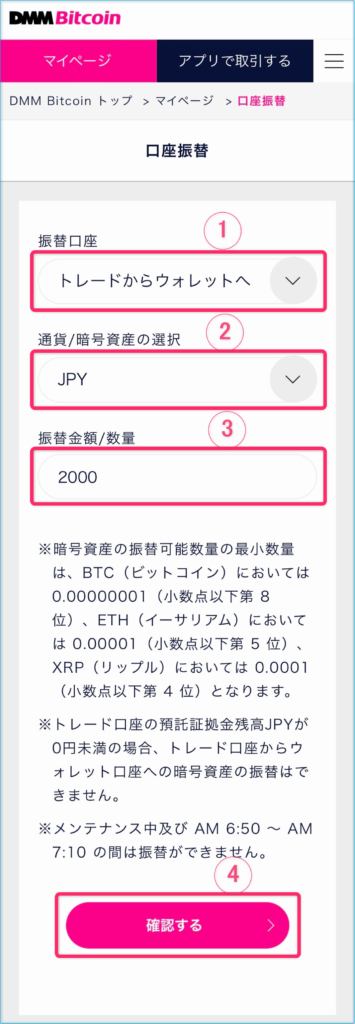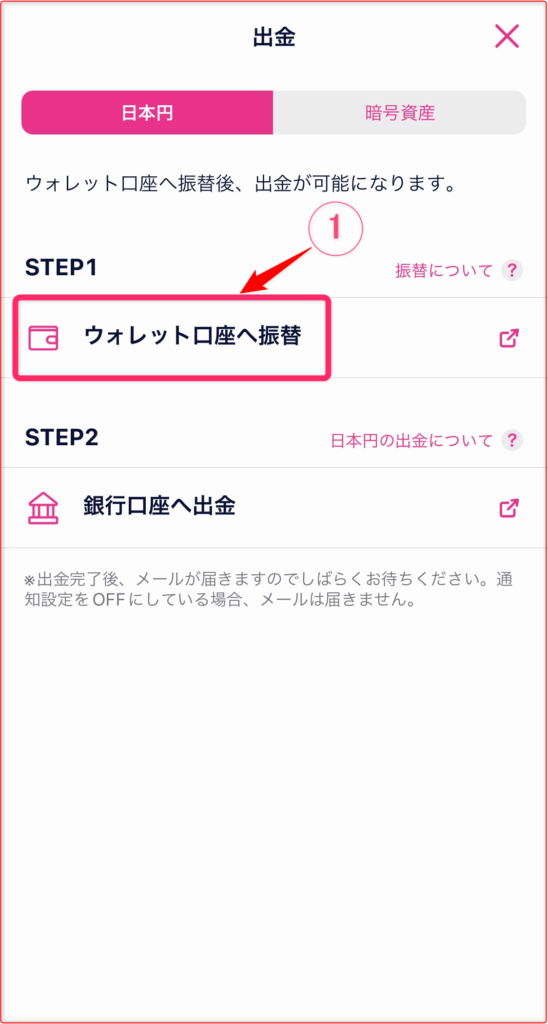 ① 振替口座は「トレードからウォレットへ」を選択します。
