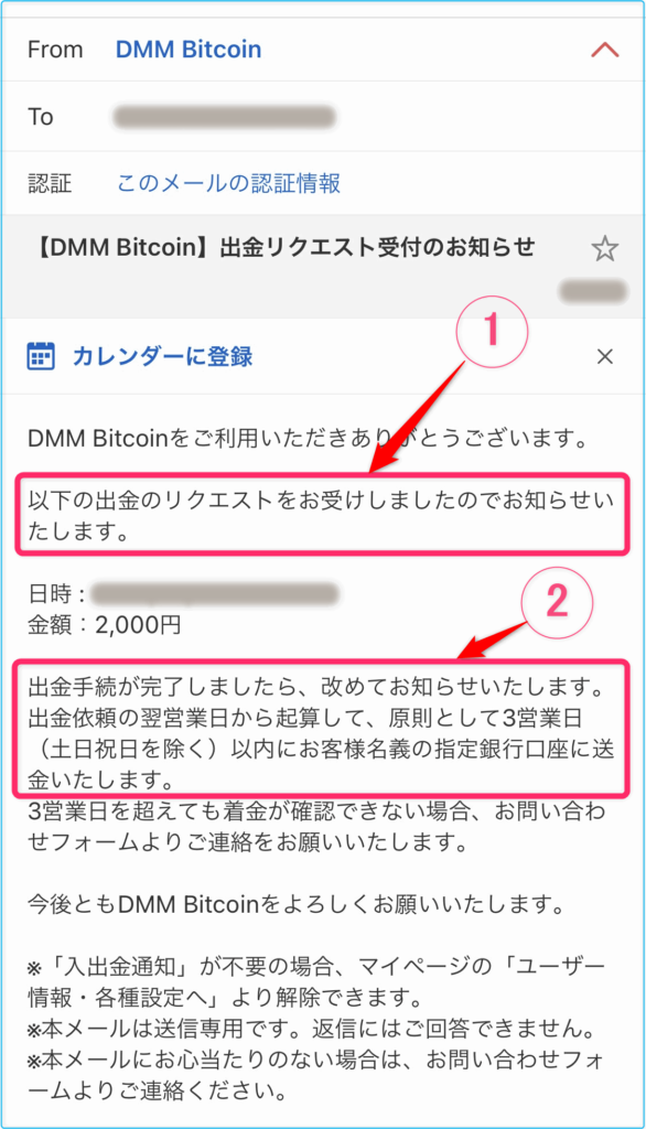 あなたが「DMMビットコイン」へ登録しているアドレスへこちらの「出金リクエスト受付のお知らせ」メールが届きます。