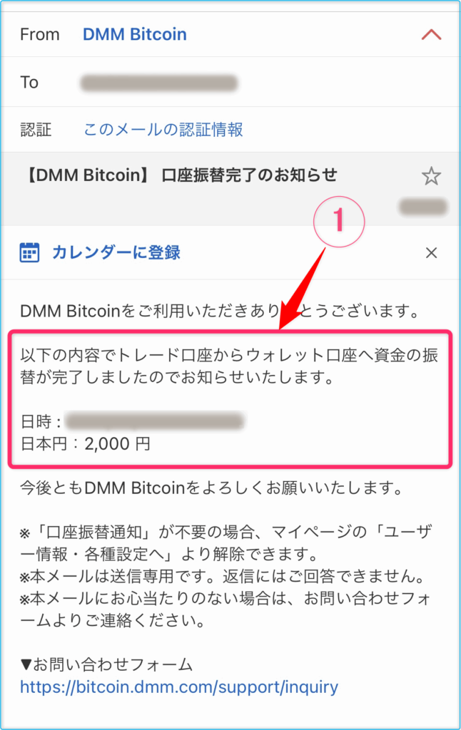 ① 「2000円の口座振替が完了」したことがこのメールで確認できます。