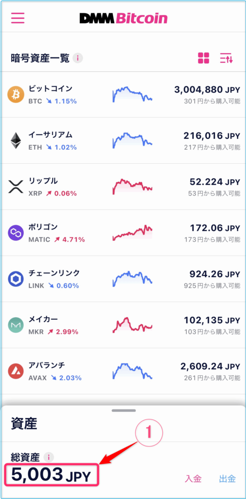 ① 現時点での「総資産額」は「7003円(JPY)」がここで確認できます。出金手続き後は2000円(JPY)引いた額になっているはずです。
