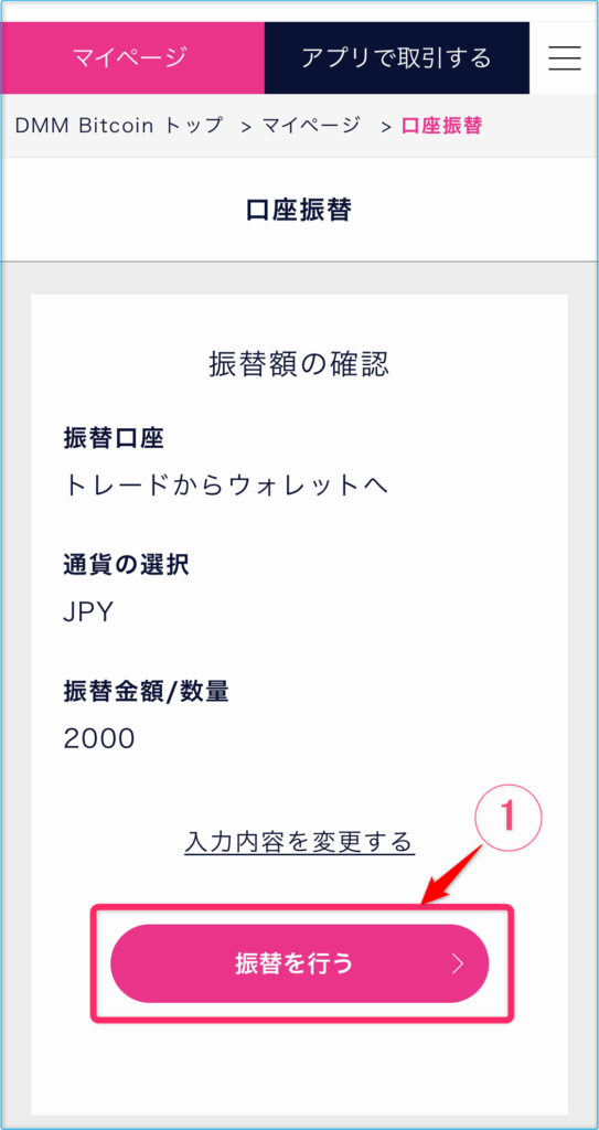 ① 「振替が完了いたしました。」が表示されたことで「トレード口座からウォレット口座へ2000円(JPY)の振替手続き」が完了したことが確認できます。