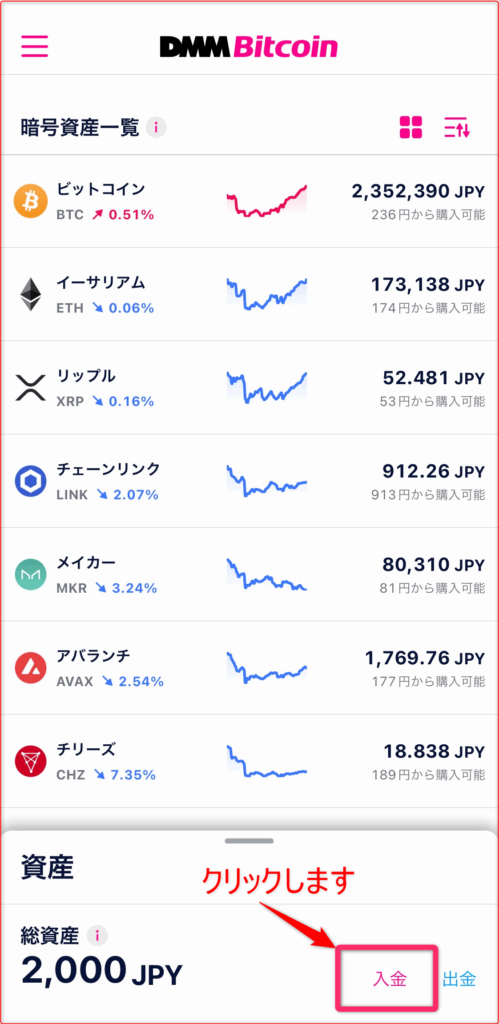 画面の下方にある「入金」をクリックします。