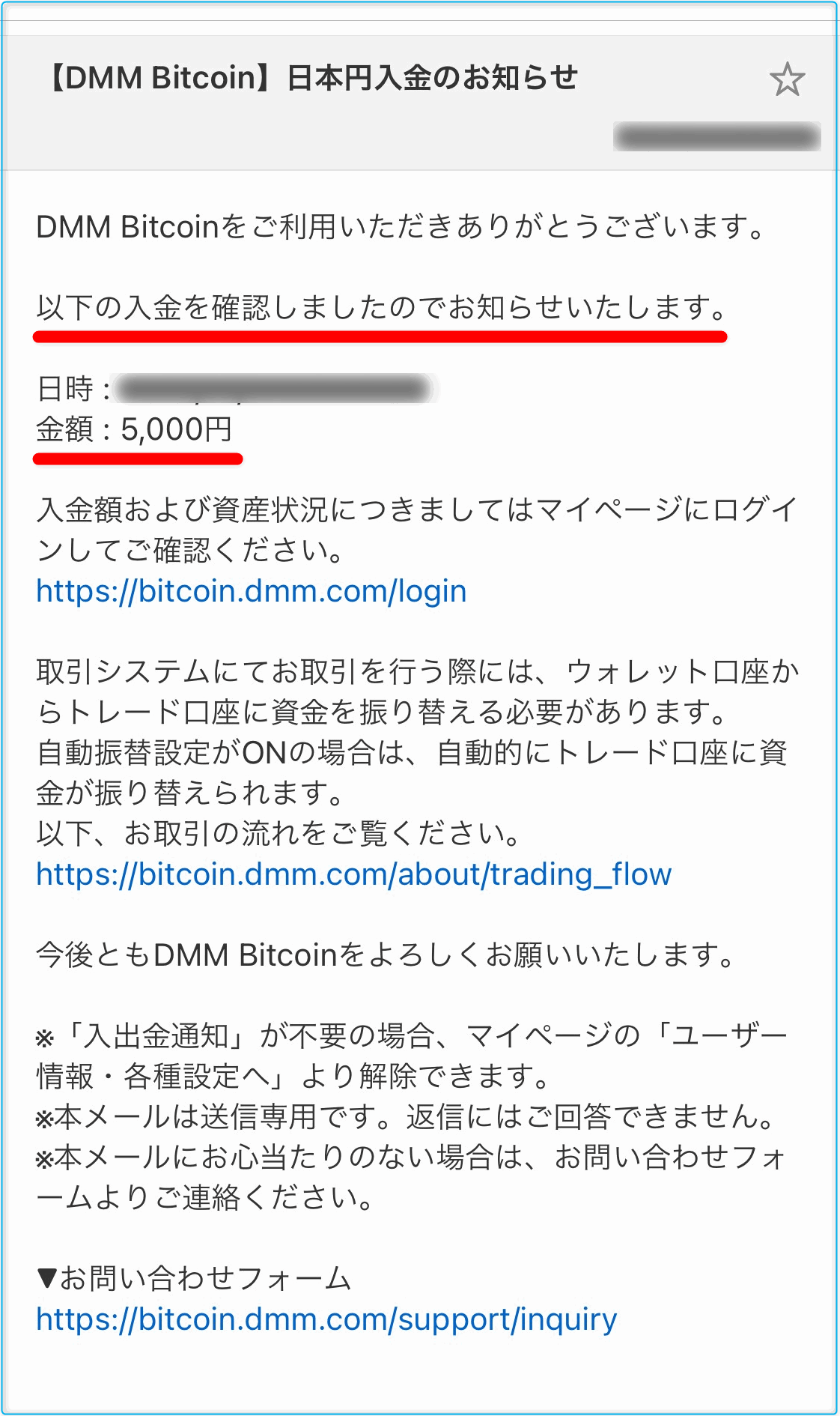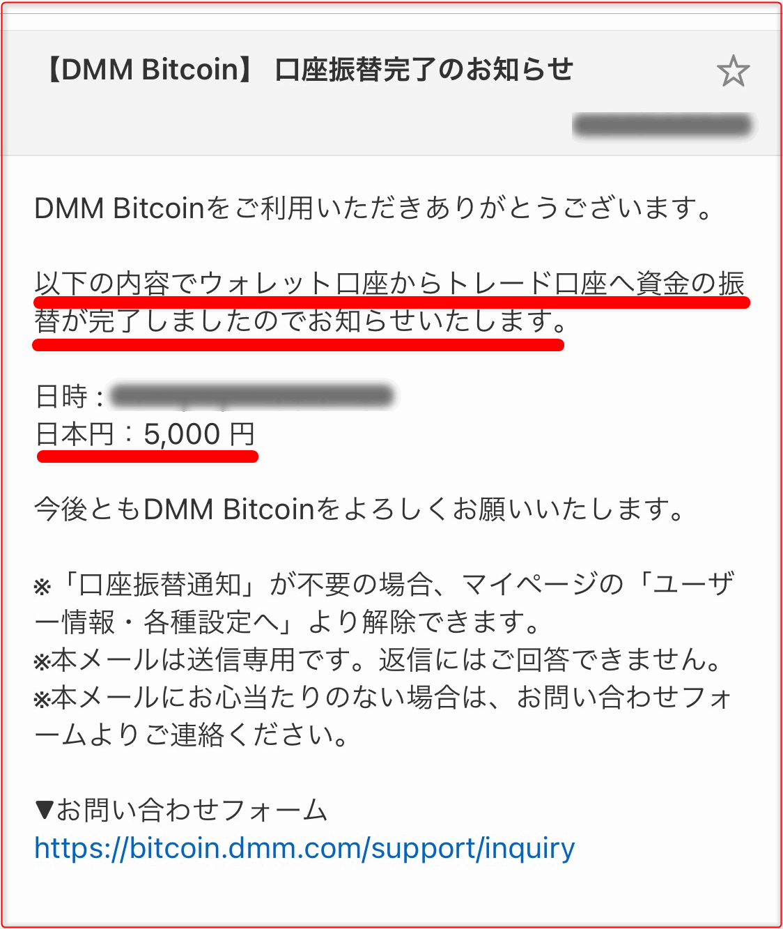 下の画面は「ウォレット口座」から「トレード口座」へ5000円が(振替)移されたことを知らせるメールです。