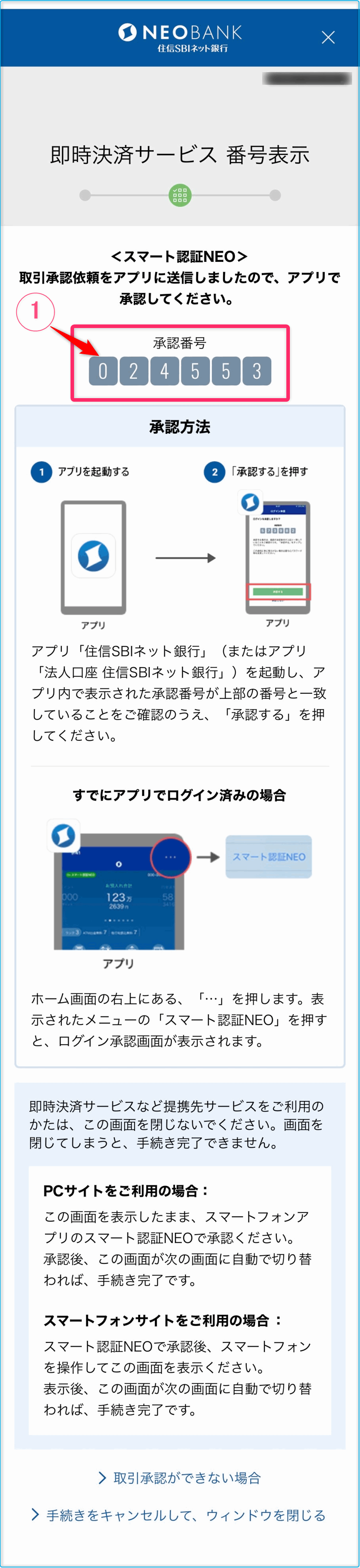 先程、認識した「承認番号」とこの画面の「承認番号」が同じことを確認します。