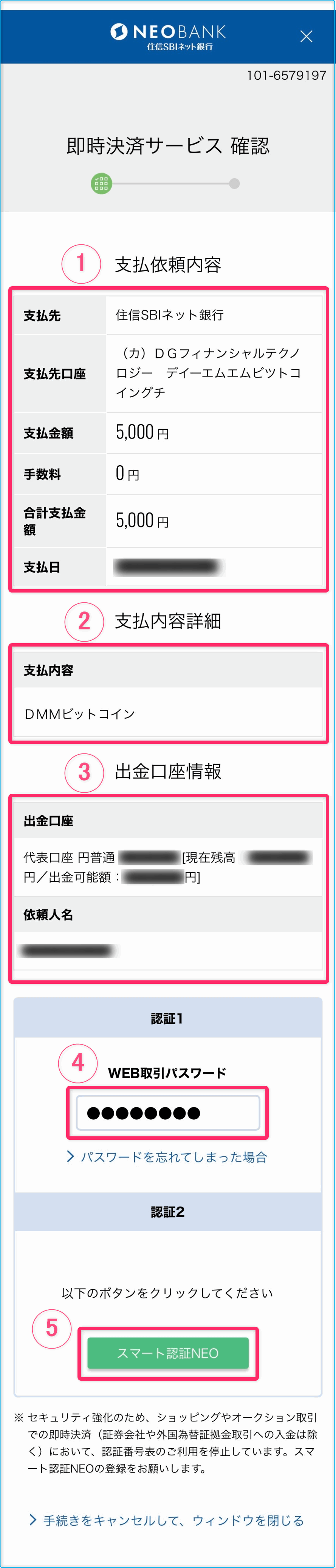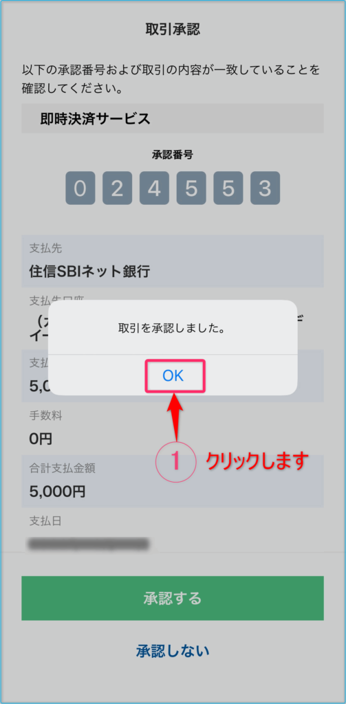 今回は金融機関を「住信SBI銀行」を指定して、入金額を5000円にした時を例にして解説を進めていきます。