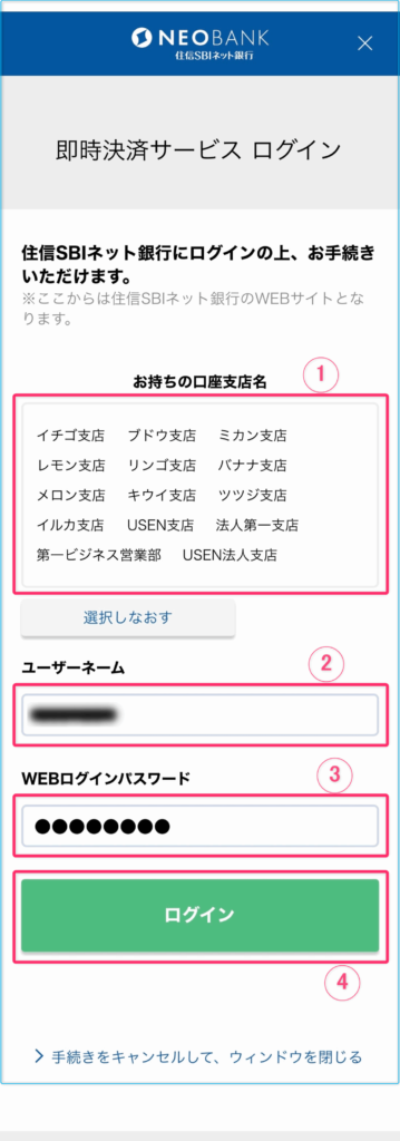 ① 金融機関名を「住信SBI銀行」を指定してあります。
