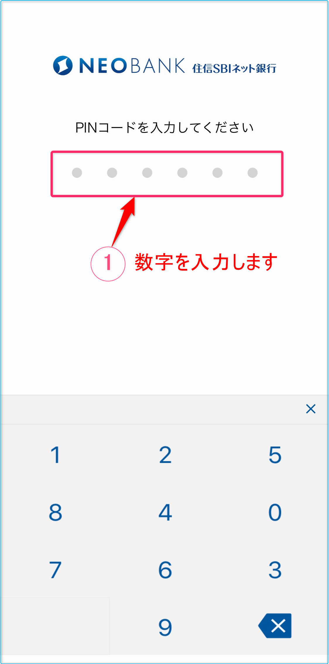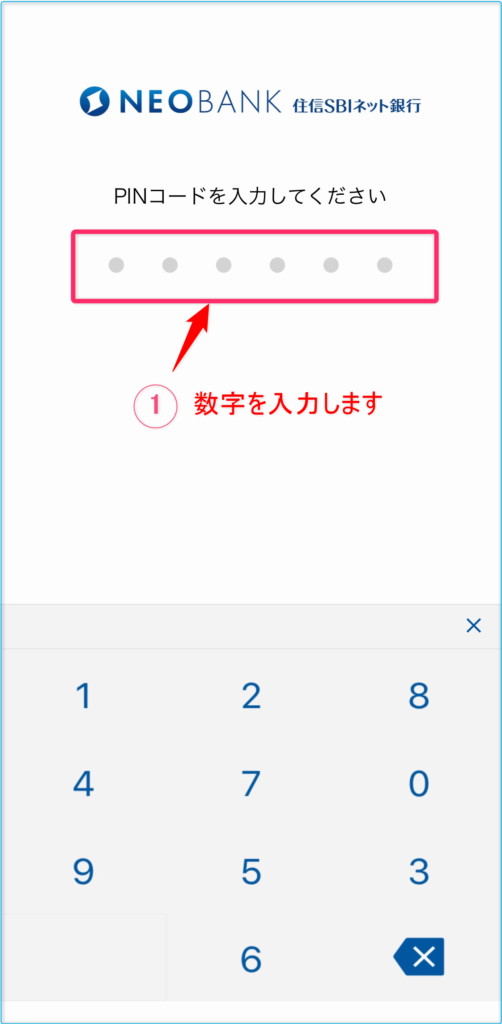 下の画面は「PINコード」を入力します。 ※ この画面は出ないこともあります。