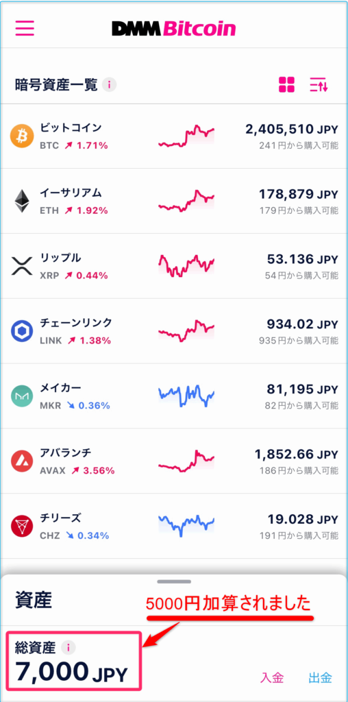 5000円(JPY)を入金したことで、総資産額が2000(JPY) ⇒ 7000(JPY)へ変わったことが確認できます。